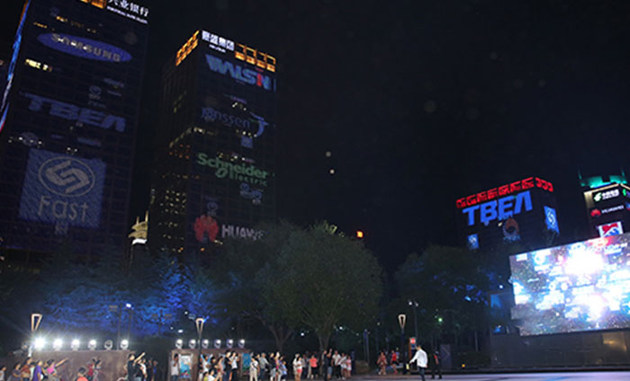 隨后觀摩燈光秀展演及周邊夜景亮化效果。北廣場(chǎng)上絢麗多彩的燈光秀吸引了不少路人駐足欣賞。這里的燈光秀為國(guó)內(nèi)首次在戶外應(yīng)用機(jī)器人臂舞動(dòng)LED屏幕,不斷變換的美麗圖案、不斷閃爍的彩燈令人應(yīng)接不暇。沿著錦業(yè)路、唐延路、科技路一路向北,這里的彩燈最為集中,也最璀璨照人。