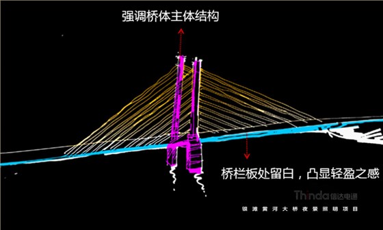 銀灘黃河大橋夜景亮化設計中我們以功能性、裝飾性照明為主,同時也避免高亮度、多光色對行車造成安全隱患。